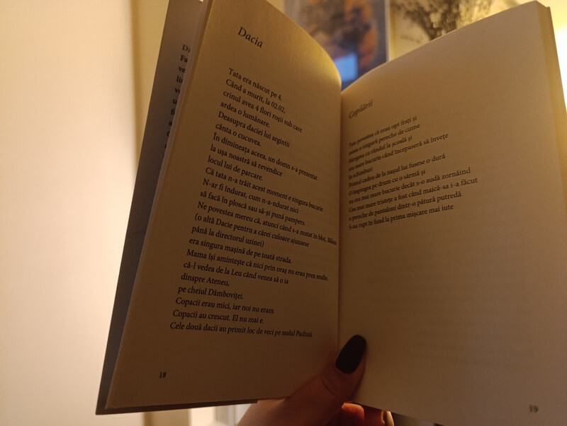 Pendulăm între trecut și prezent, care este o linie foarte fină între dorința de redimensionare a vieții și așteptările sau proiecțiile. Totul se definește prin imaginea tatălui, nici nu mai știu câte poezii încep și se încheie cu acest cuvânt „tată”, dar cel care mi s-a imprimat pe retină este cel care începe cu „Eu l-am omorât pe tata”, un vers puternic, șocant, care te face să îți respirația și   să te întrebi ce ar mai putea urma după o asemenea confesiune, nu intuiești că te mai așteaptă multe pagini pline de tandrețe, de reconciliere cu sine, cu pierderea, cu lumea.
