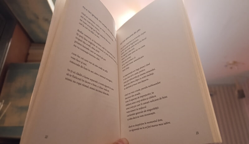Se deschide cu o poezie care trasează coordonatele maximale ale „dezbaterii poetice” la care urmează să participăm, îmi place cum mânuiește structura poetică, faptul că nimic nu cade în diarism, poezia are locuri în care se contorsionează sau respiră, astfel încât să te țină mereu în gardă. „de aici, din centrul lucrurilor care/ nu se vor întâmpla niciodată”, anunță o matematică a celei care știe deja ordinea lucrurilor, visează conștient cu ochi deschiși. Apoi trecem la idealurile care nu sunt redate deloc nesigur sau mult prea zaharisit: „să vezi o inimă cum huruie lîngă altă inimă/ un explozibil care-l însuflețește pe un altul/ cît să răbufnească fără teamă”. Dar minunea nu ține mult revin la substratul putred, viermănos, auto-distructiv al vieții.