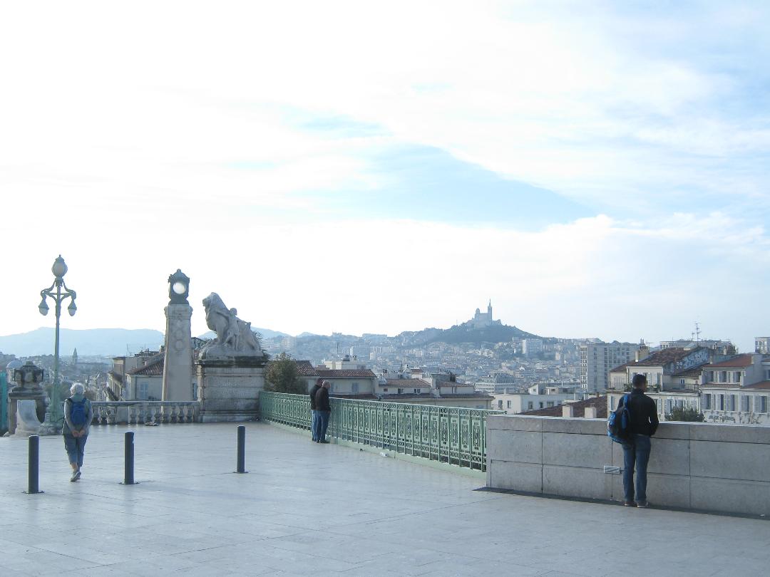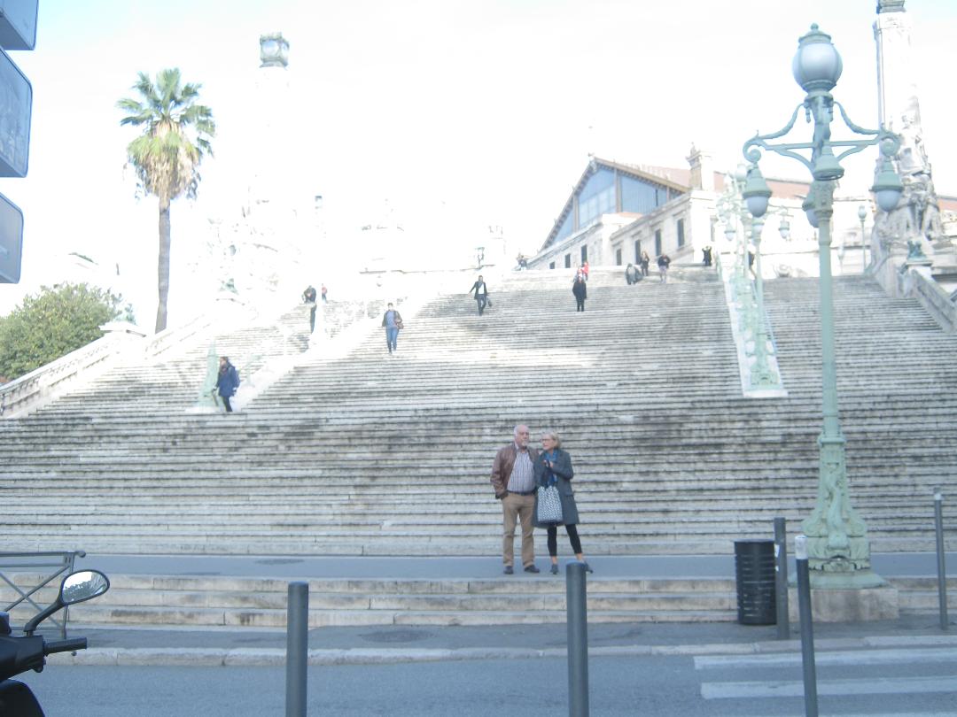 Dar unde e Provence, cea atât de cântată și pictată? Era la locul ei, deși eu n-am văzut-o decât din tren. E frustrant să treci pe lângă Arles și să nu ți se arate decât blocuri modeste și mici hale industriale cum se găsesc în preajma tuturor celorlalte orașe. Dar fiind clar că nu puteam vedea totul în puținul timp care-mi mai rămăsese am ales Marsilia, de unde tot urma să iau avionul spre casă. Trenul a plecat din Montpellier din gara Saint-Roch (protectorul orașului. Roch se citește roc, spre deosebire de Foch care se citește foș; poate că occitana și-a vârât coada și aici) și a ajuns la Marsilia în zori, în gara Saint-Charles (care nu știu cum se citește; probabil șarlă). Sfinți feroviari. La ieșire mi-a apărut la picioare o scară monumentală cam ca cea din Odesa, din vârful căreia se zărea panorama locurilor. Frumoasă primire!