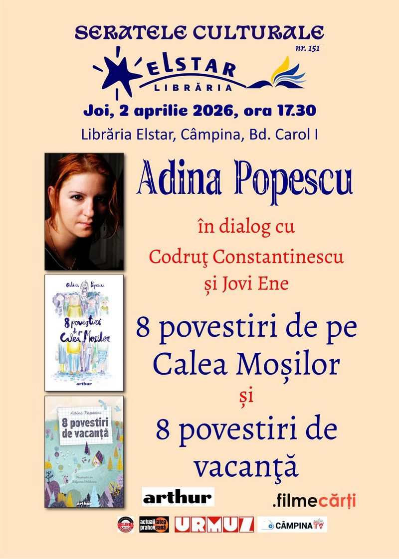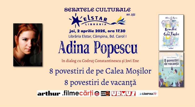 Librăria Elstar și Editura Arthur vă invită joi, 2 aprilie 2026, ora 17.30, la Librăria Elstar (Câmpina, B-dul Carol I, nr. 44), la o nouă ediție a Seratelor culturale Elstar, care va găzdui un dialog al scriitoarei și jurnalistei Adina Popescu cu Codruț Constantinescu și Jovi Ene, despre volumele „8 povestiri de pe Calea Moșilor“ și „8 povestiri de vacanță”.
