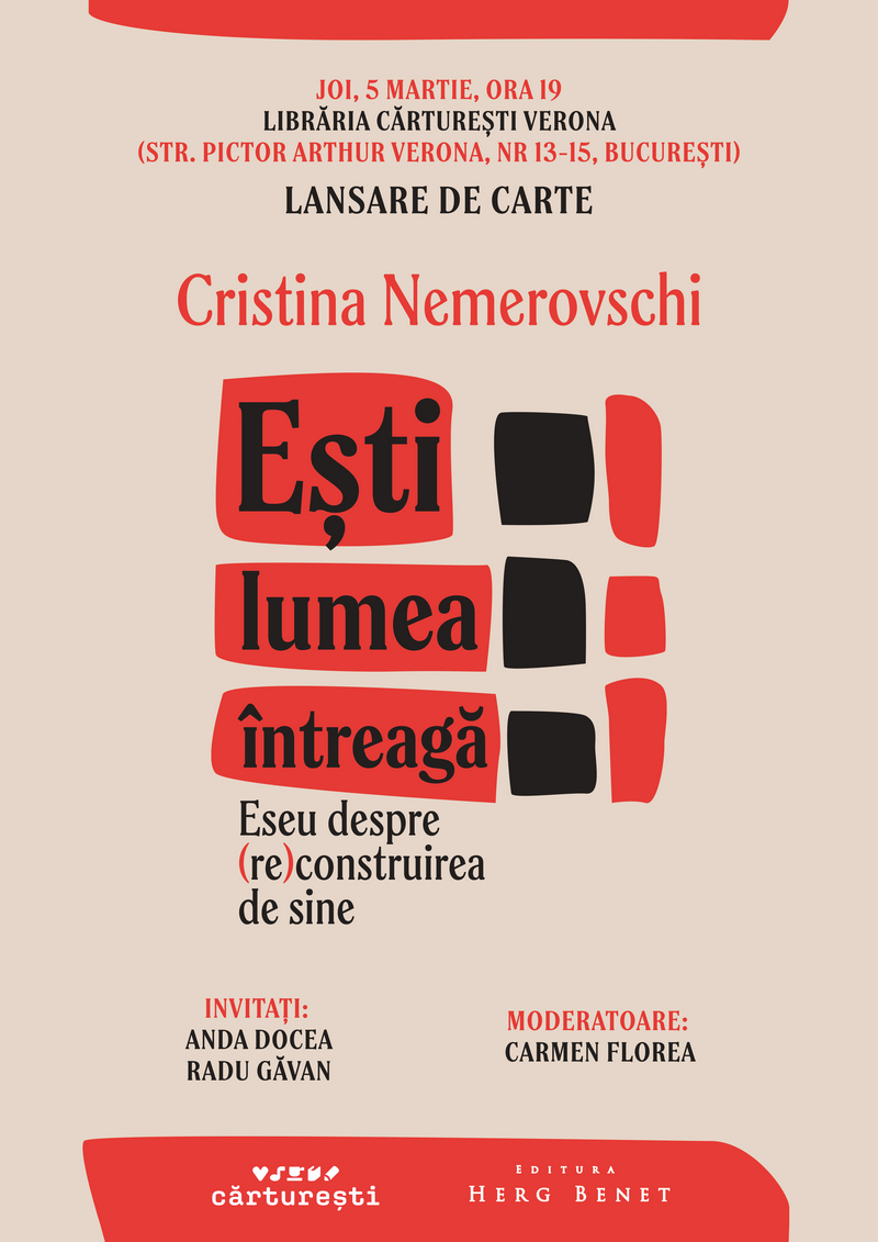 Joi, 5 martie, de la ora 19, la Librăria Cărturești Verona din București va avea loc lansarea volumului de non-ficțiune “Ești lumea întreagă. Eseu despre (re)construirea de sine”, semnat de Cristina Nemerovschi și apărut la Editura Herg Benet. La eveniment, alături de autoare, vor vorbi scriitorii Anda Docea și Radu Găvan, iar dezbaterea va fi moderată de Carmen Florea.