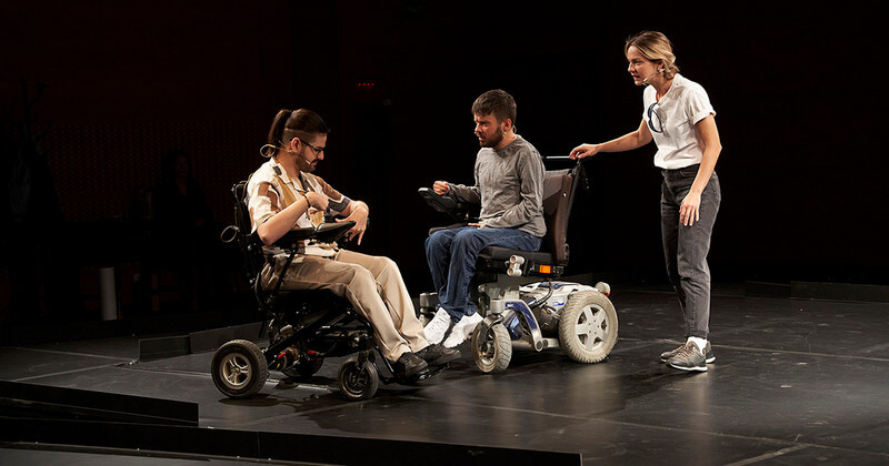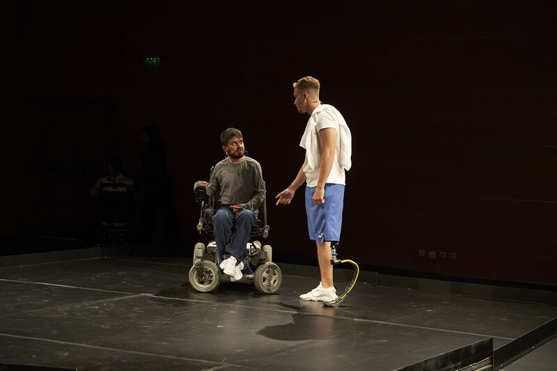Scenografia este redusă la esențial și funcționează mai degrabă ca suport pentru discursul uman decât ca element spectaculos în sine. Spațiul de joc este construit în jurul unei scene cu pante, care sugerează constant ideea de dezechilibru și dificultate de deplasare, fără a încărca vizual reprezentația. În fundal, proiecțiile video aduc în prim-plan situațiile concrete ale celor patru tineri cu dizabilități motorii, oferind spectatorului repere biografice necesare pentru a înțelege parcursul și realitatea fiecăruia. Aceste inserții nu întrerup fluxul scenic, ci completează discret acțiunea, adăugând un strat de claritate și apropiere față de experiențele prezentate.