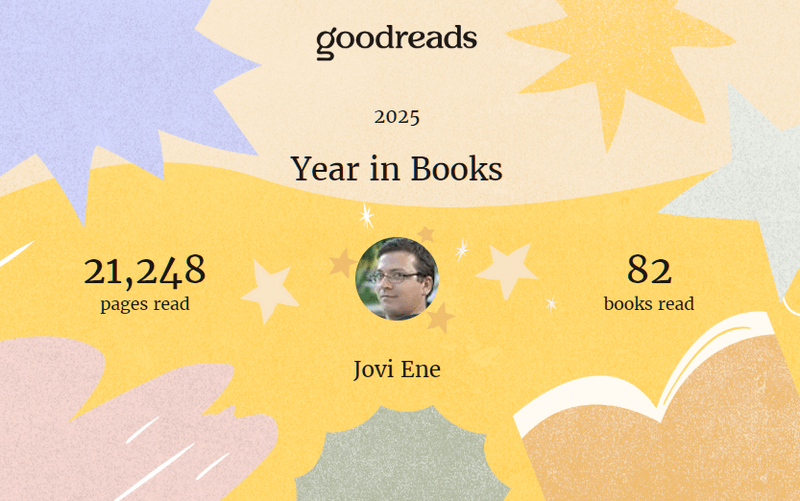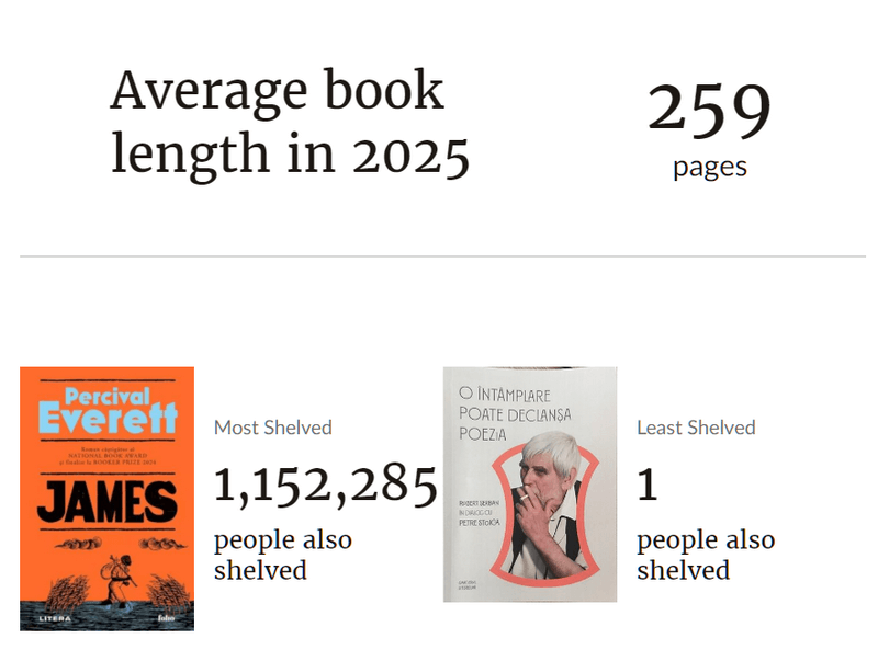 Conform statisticilor de pe Goodreads.com: în 2025, am citit 82 de cărți, cu două mai multe față de anul anterior, respectiv 21.248 pagini, o medie de 58 de pagini pe zi, mai bine decât în 2024. În 2025, mi-am ales mai bine cărțile citite (deși mereu mi-am dorit să citesc mai multe), am citit cărți extraordinare, după cum se vede și în sistemul (personal, subiectiv) de notare de pe Goodreads – nu mai puțin de 29 de cărți din 82 au primit cinci stele, asta înseamnă mai mult de o treime, 35%.