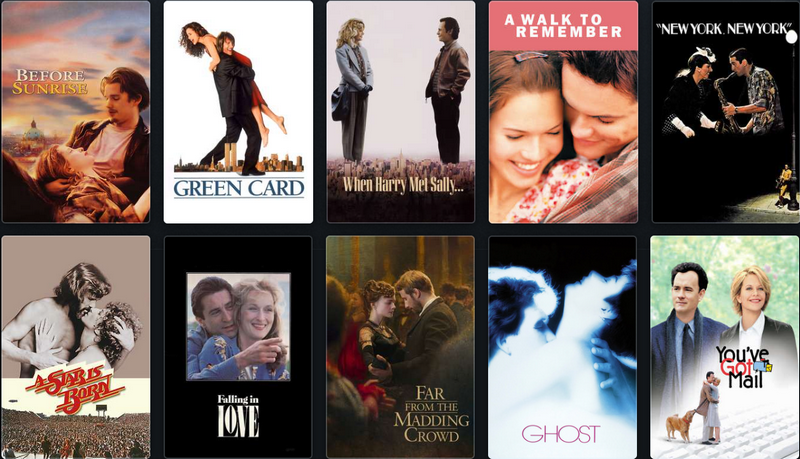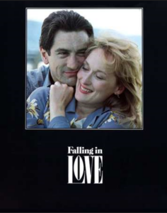 În Falling in Love, un clasic al genului, avându-i în rolurile principale pe Robert De Niro și Meryl Streep, doi străini, Frank și Molly se ciocnesc unul de celălalt din întâmplare în timpul perioadei aglomerate a Crăciunului, când toată lumea aleargă să cumpere cadouri pentru cei dragi. Singurul impediment ce stă în calea iubirii lor este faptul că amândoi sunt căsătoriți, iar acest lucru aduce un conflict puternic Filmul prezintă în subsidiar New York-ul anilor ’80, aflat în plină eră Regan. Pe fundalul acestuia se derulează povestea de iubire a acestui cuplu middle-class ce cucerește prin spontaneitate și naturalețe.