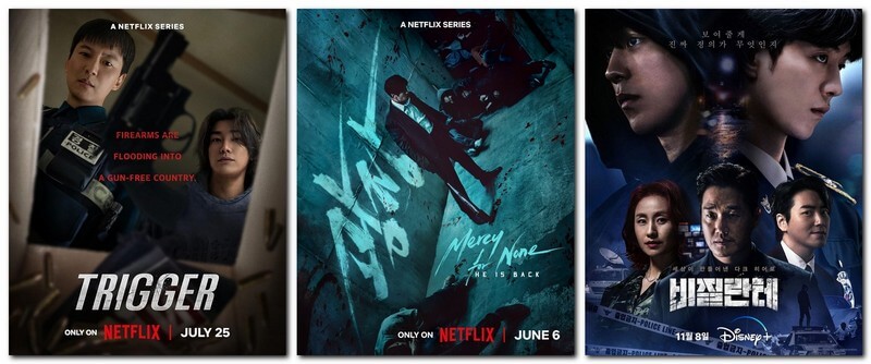 Al doilea serial, din același spațiu geografic, este „Trigger” este un thriller sud-coreean lansat în 2025 pe Netflix, alcătuit din 10 episoade și construit în jurul unui scenariu alarmant: într-o Coree de Sud unde armele de foc sunt strict interzise, pe piață încep să apară în masă arme ilegale, declanșând crime, panică și haos social. Personajul central, Lee Do (Kim Nam-gil), fost lunetist militar devenit detectiv, este desemnat să investigheze fenomenul și să identifice sursa traficului. Ancheta îl conduce către figura carismatică a unui antagonist, un traficant de arme cu motivații ambigue, prins la rândul lui într-o rețea mult mai complexă decât pare la început. Serialul explorează nu doar conflictul dintre cele două personaje, ci și impactul psihologic și social al accesului brusc la arme într-o societate care nu este pregătită pentru violență, abordând teme precum responsabilitatea, manipularea și fragilitatea instituțiilor. Regia și scenariul poartă semnătura lui Kwon Oh-seung, care mizează pe tensiune constantă, cadre întunecate și ritm alert.