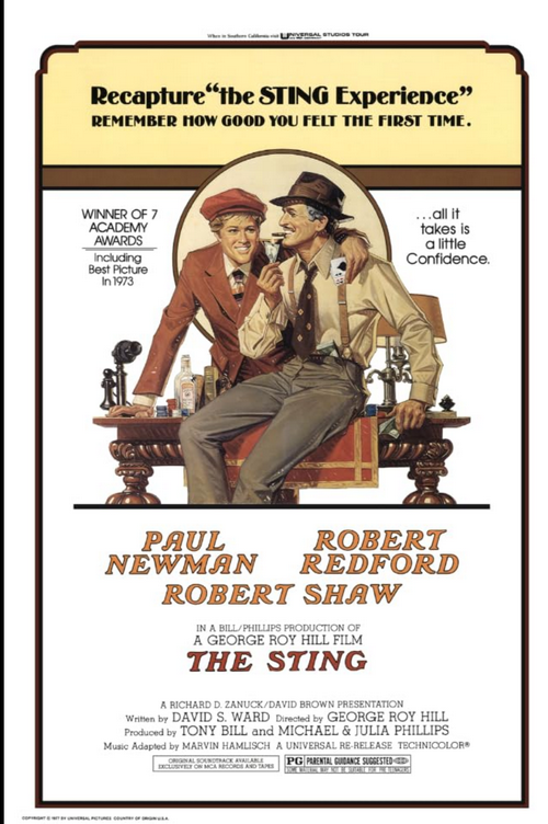 Robert Redford și Paul Newman aveau să se reîntâlnească cu regizorul George Roy Hill pe platorurile unui alt film de mare succes – ‘The Sting’. Cei doi actori au împărtășit o prietenie legendară vreme de 40 de ani, construită pe încredere și un respect reciproc profund. Ambii bărbați apreciau viața de familie și integritatea în actorie și aveau un comportament similar – liniștit, dar plin de umor manifestat inclusiv prin farse și păcăleli în timpul producției filmelor. Acțiunea filmului ‘The Sting’ se petrece în 1936 și prezintă un complot complicat, pus la cale de doi escroci profesioniști (Paul Newman și Robert Redford) pentru a-l înșela pe un șef mafiot (Robert Shaw). Și acest film este inspirat de personaje reale – scenariul lui David S. Ward a fost inspirat de escrocheriile comise de frații Fred și Charley Gondorff. Coloana sonoră este remarcabilă pentru utilizarea muzicii ragtime, memorabilă fiind în special melodia „The Entertainer” de Scott Joplin, care a fost adaptată (împreună cu alte piese de Joplin) pentru film de Marvin Hamlisch. Filmul a câștigat șapte premii Oscar, inclusiv cel pentru cel mai bun film. Redford a fost nominalizat pentru premiul pentru cel mai bun actor în rol principal, dar nu l-a câștigat, fiind preferat Jack Lemmon pentru rolul din ‘Save the Tiger’, ceilalți candidați fiind Marlon Brando (‘Last Tango în Paris’), Jack Nicholson și Al Pacino (‘Serpico’). În România comunistă filmul a avut parte de o distribuire ‘interesantă’. Nu a fost adus în rețeaua comercială, dar a fost proiectat la cinemateca aflată în acei ani la cinema ‘Union’.