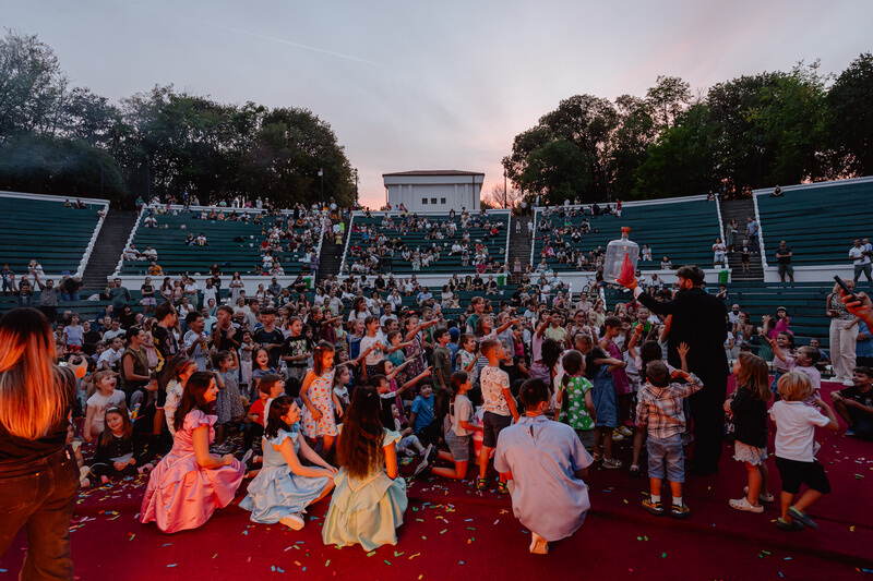 Atmosfera va fi completată de artiștii Ontimo Motion, care aduc în teatrul de vară un univers al culorii și al veseliei, prin jonglerii spectaculoase, baloane uriașe de săpun, picioroange, acrobații și ateliere de Hula-Hoop. Distracția continuă cu spectacolele interactive semnate de Profesorii Trăsniți, pline de experimente uimitoare cu gheață carbonică, și cu farmecul inconfundabil al lui Teo Magic Show, care îi va cuceri pe copii și părinți deopotrivă.